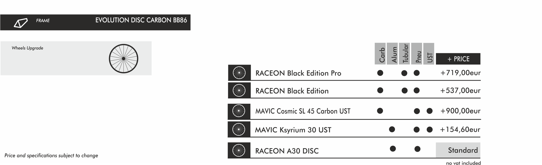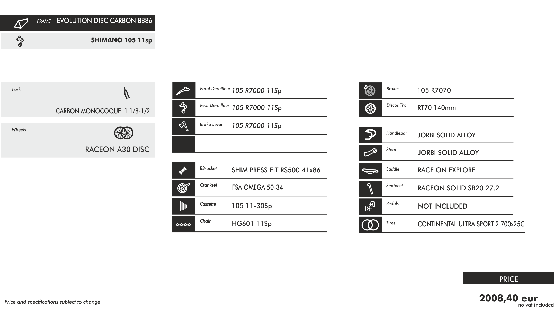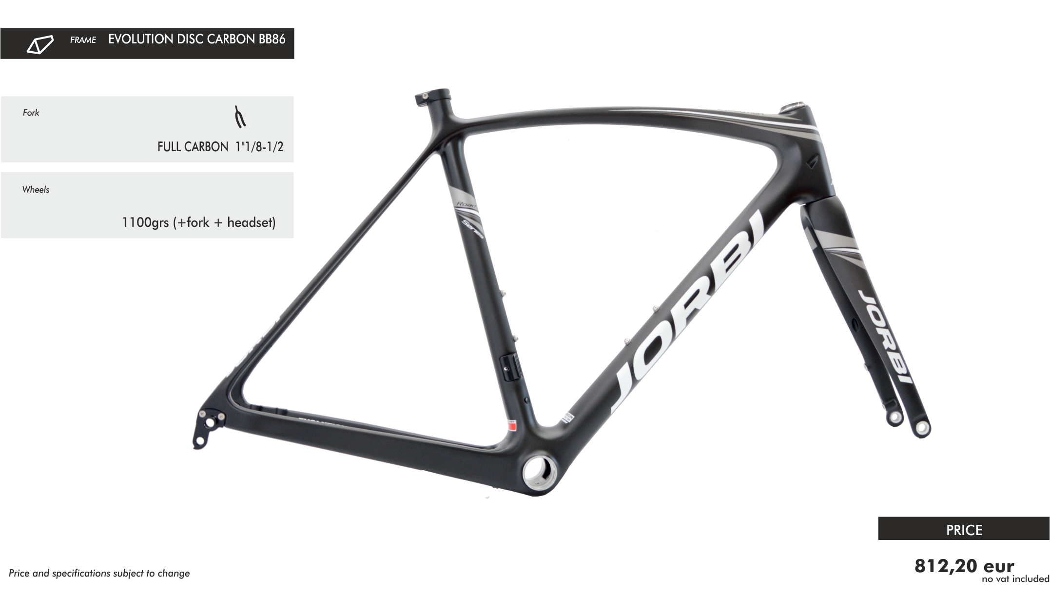 Evolution Frame Fast and agile is the ideal frame for amateurs and future champions, the Evolution built in T700 carbon fibers and available in 5 different sizes with a slope of 3cm has a fairly accurate geometry that allows you to enjoy and take advantage of a bike without limits. Press Fit 86, Full Carbon Tapered 1 "1/8 x 1.5" fork, as well as the possibility of mounting mechanical or electric groups, are some of the key points of this model.