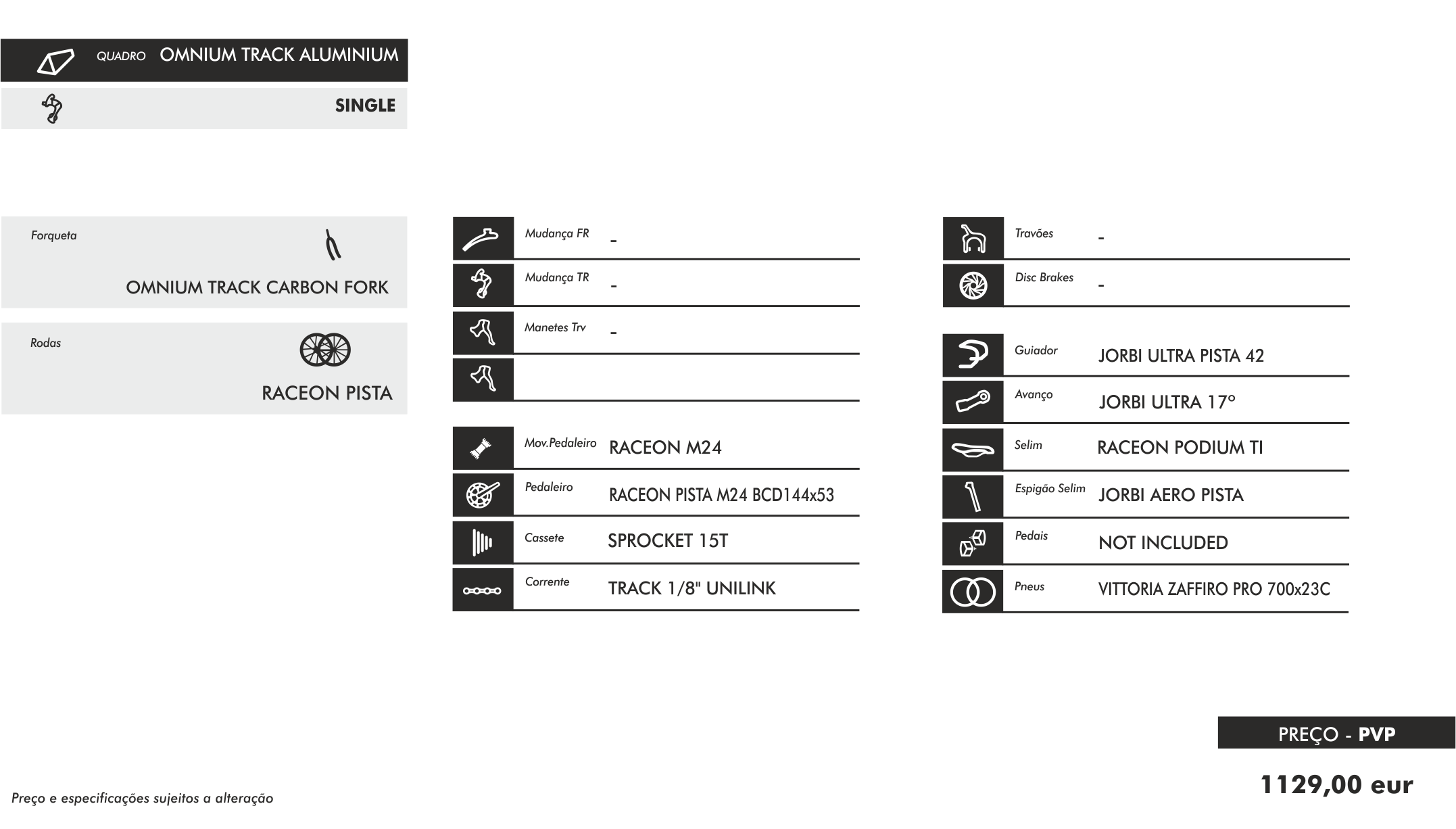Omnium Aluminium Being the most economical version of Track for competition, this model built in 7075 aluminum alloy, with perfectly disguised welds, mounts a special Full Carbon Tapered 1 "1/8 x 1.5" fork having the same geometry as its carbon congener allowing large Performances inside the Velodromes, ideal frame for who wants to start in this fantastic modality is available in 4 different sizes which allows a perfect fit for each one.